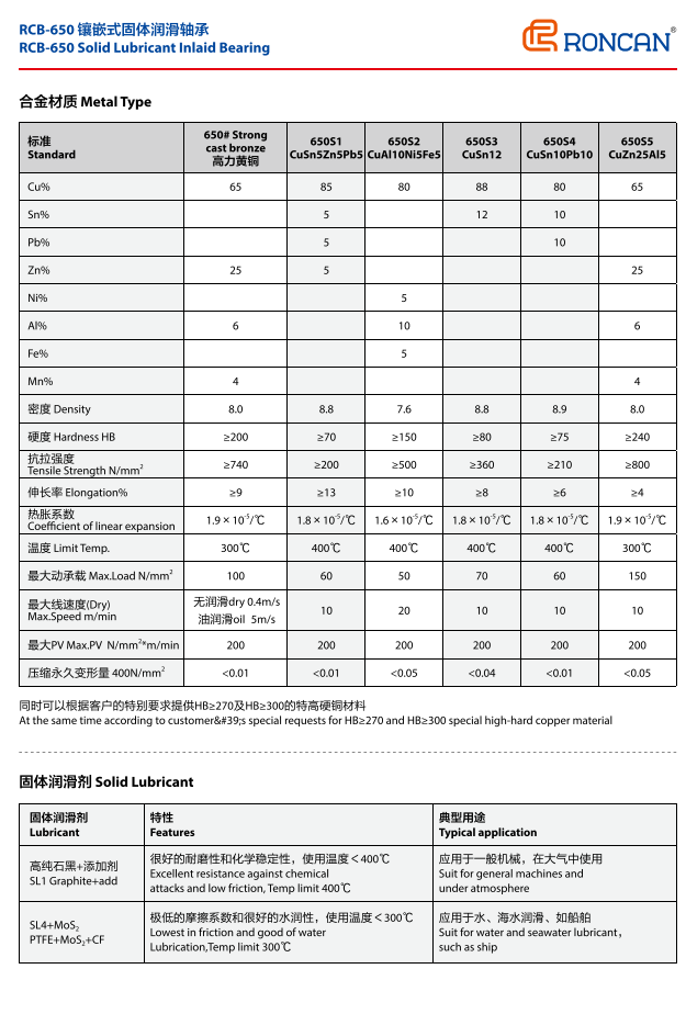 RCB650是通用的基础产品,无论高压、低压、高温、低温、有油润滑、无油润滑还是水中润滑。都能适用。产品的基体是高力黄铜,比一般的铜套硬度提高一倍。耐磨性能提高一倍以上。因此在冶金行业的连铸机、轧机、输送机上都可采用。还用于塑料注塑机锁模机构,挤出机构。高压电的自动开关,建筑机械的起吊支撑部位,以及水利枢纽工程的弧门支撑。滑轮和传动轮部位。还有造纸机烘道、汽车模具、船舶起锚滑动部位等。